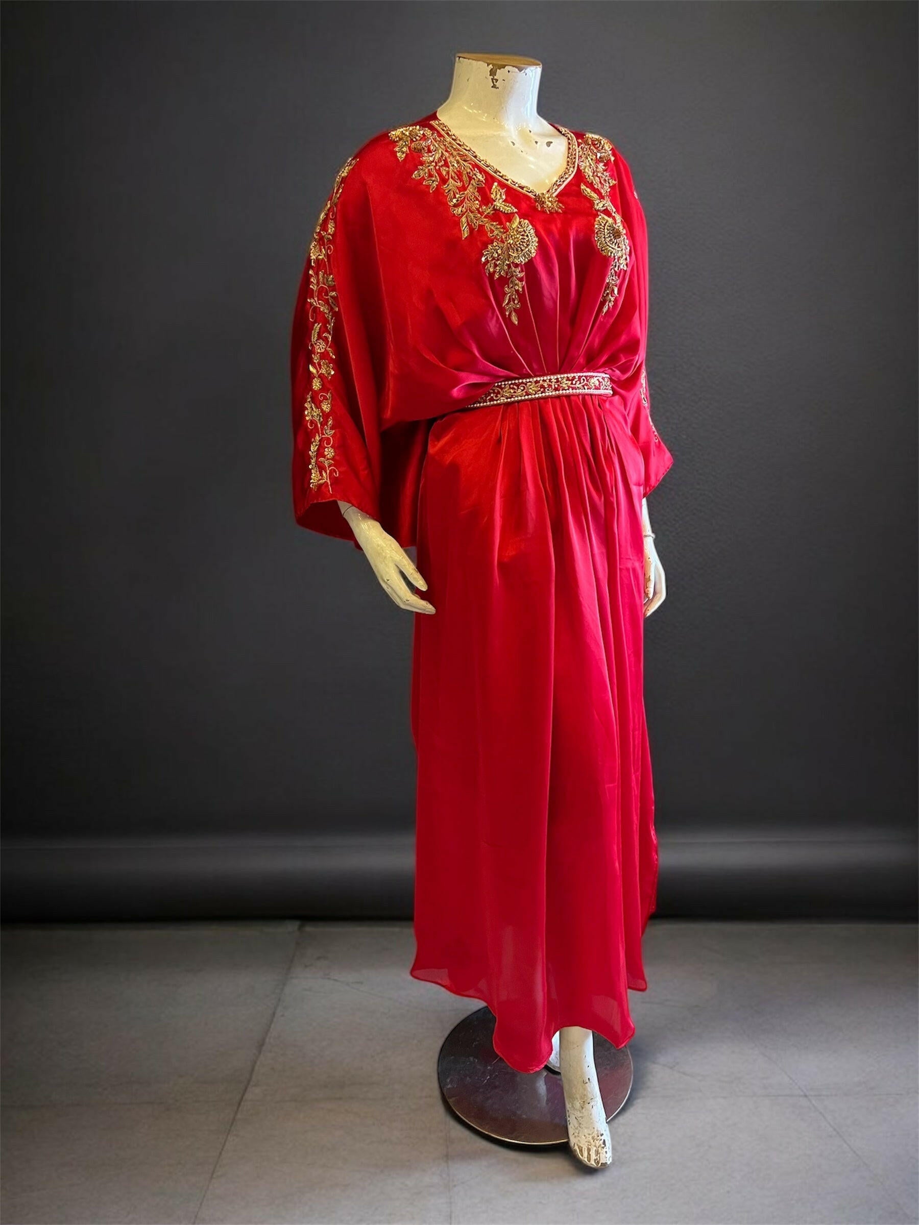 Description: Elevate your occasion wear with this luxurious Ruby Red Kaftan, crafted from lightweight georgette fabric for a graceful flow. Featuring exquisite gold embroidery along the neckline and sleeves, this dress combines elegance with comfort. The adjustable belted waist enhances your silhouette, making it perfect for weddings, festive events, and evening parties.